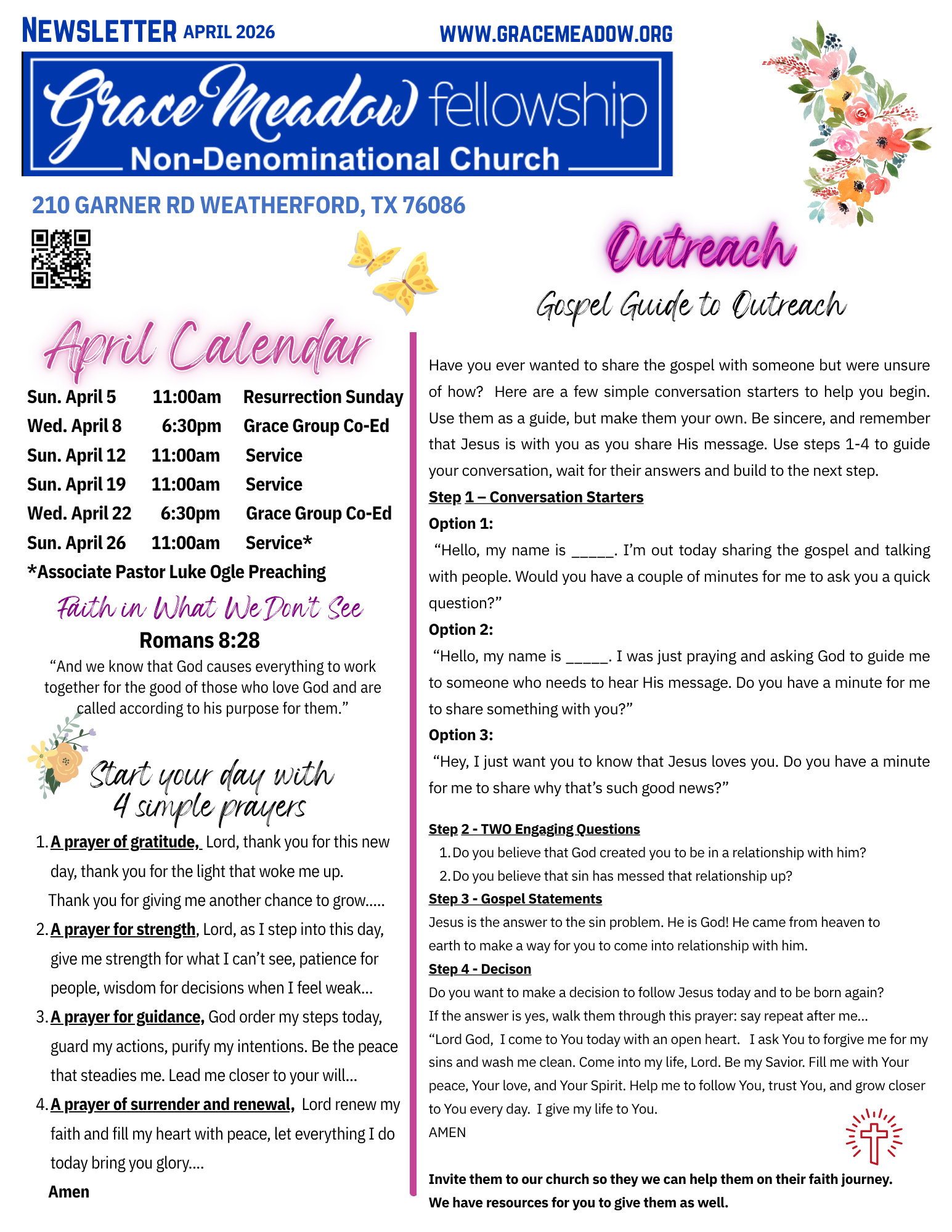 Grace Meadow Fellowship is a warm and loving church that will embrace you with God’s love. If you are considering a new place of worship or a relocation to our area, we would love to have you be our guest.